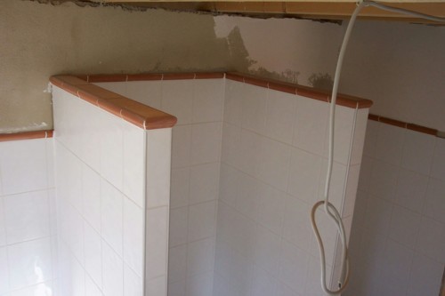 Im Bild : Ablage über dem Duschbereich mit den Fliesen der anderen Ablagen ausgeführt. Gerundete Aluminiumschienen als